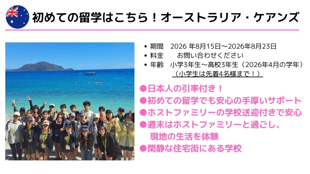おすすめのジュニア留学 2025.10.22 2024.11.18 小中高生向けおすすめのジュニア留学プログラム ー2026年夏ー このプログラムについて問い合わせる ー2026年春ー このプログラムについて問い合わせる ー2025年ー このプログラムについて問い合わせる このプログラムについて問い合わせる このプログラムについて問い合わせる このプログラムについて問い合わせる